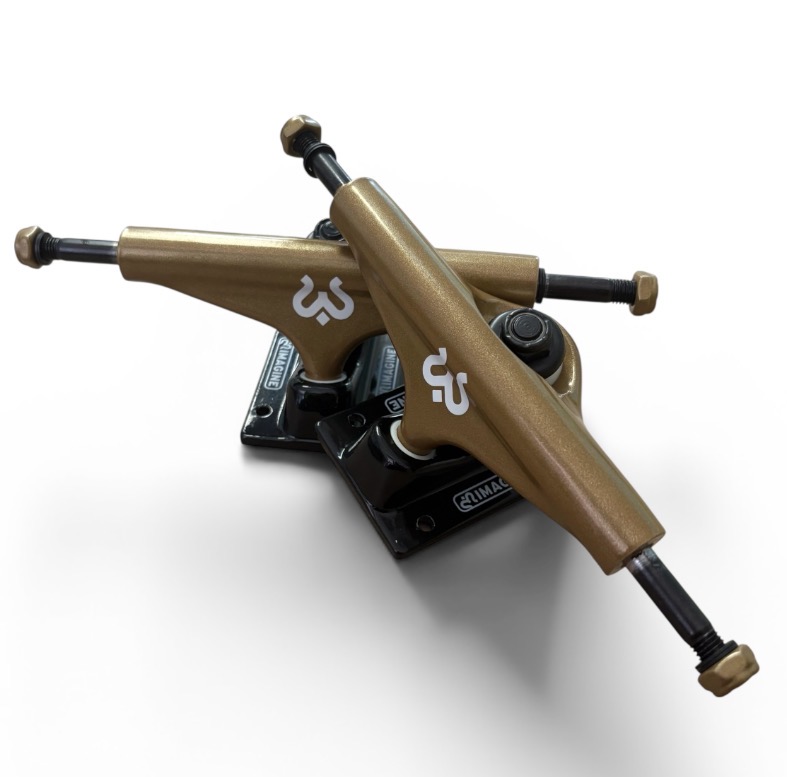 pareja de imagine truck gold black 5.25. ideal para tablas de 8″ a 8,25″. ensamblados con gomas uretano hiperflex 90A que permite un giro suave y progresivo.