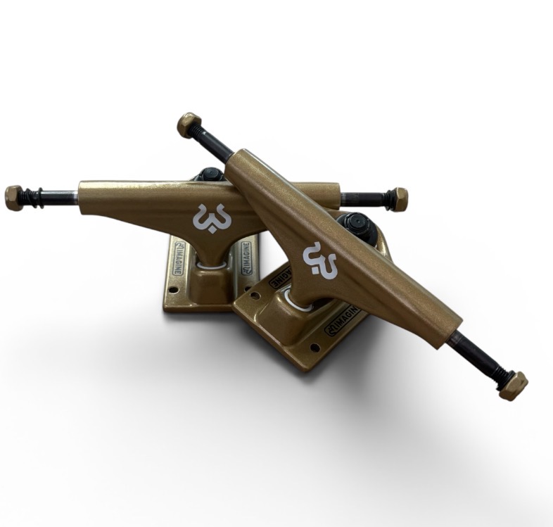 pareja de imagine truck gold gold 5.25. ideal para tablas de 8″ a 8,25″. ensamblados con gomas uretano hiperflex 90A que permite un giro suave y progresivo.
